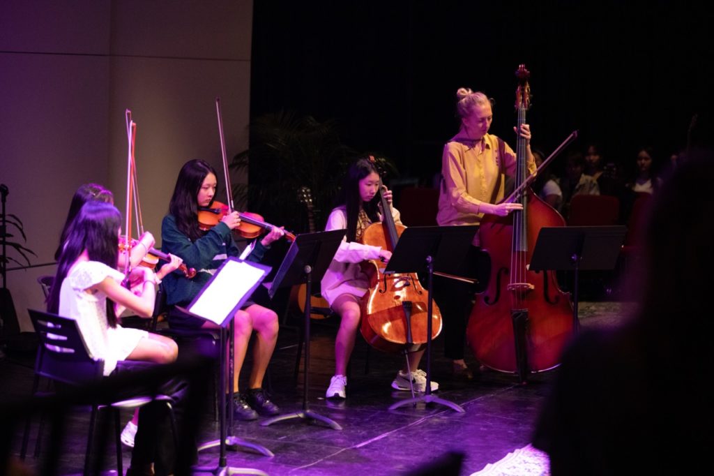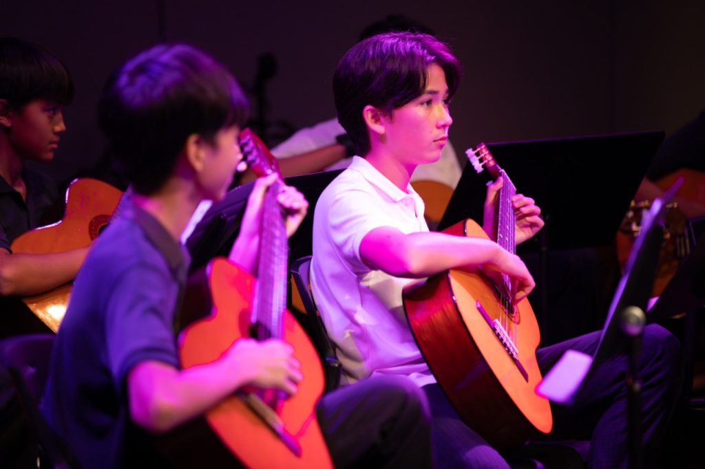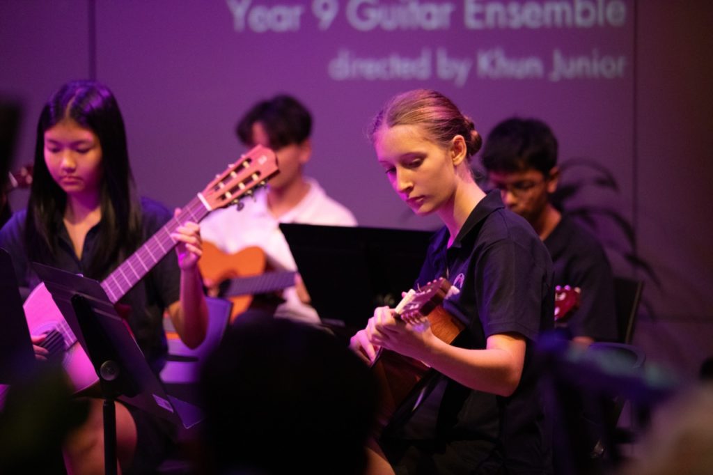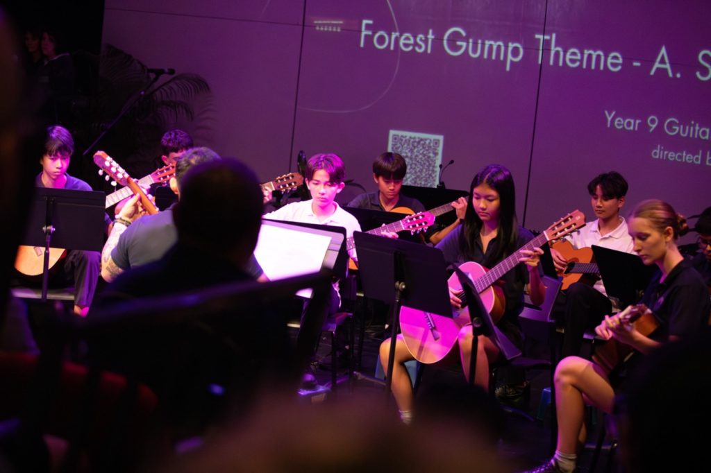 The evening opened with a gentle instrumental shimmer as the Year 9 Guitar Ensemble performed Feather Theme from Forrest Gump, setting the tone for a night that would balance quiet introspection with bold, high-energy moments. The Year 8 String Quintet followed with a delicate rendition of French Folk Tune, showcasing musical maturity beyond their years.